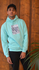 Peppermint unisex hoodie with grey scale Awoken Life print on the centre front.