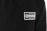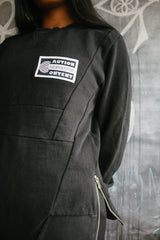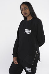 Panel design to the jumper for a more tapered fit with silver metal zips on each side. An embroidered patch on the left of the jumper reading 'Caution Conscious Content' with the flower of life pattern inside the letter C.