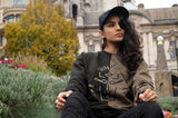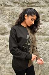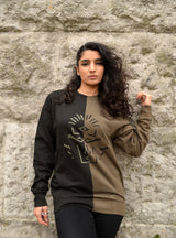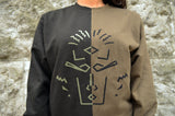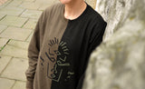 Two tone black and khaki drop shoulder style jumper for a comfortable fit. A tribal mask inspired flock print to the chest in contrasting colours and a third eye for the enlightened.