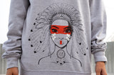 Grey drop shoulder style unisex jumper with Native Girl print. Soft feel fabric with a comfortable fit and statement image showcasing the flower of life, merkaba and dreamcatcher.