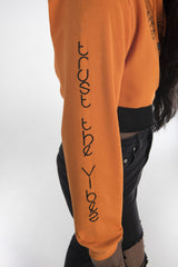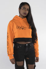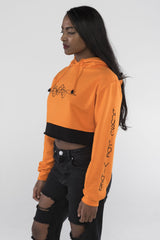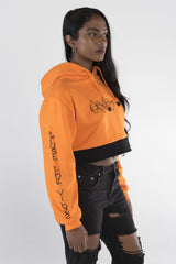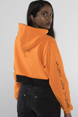 Orange crush crop hoodie with added black cotton panel to finish the bottom.
