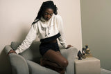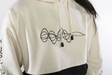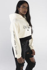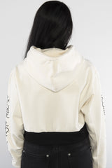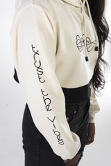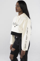 Vanilla crop hoodie with added black cotton panel to finish the bottom.