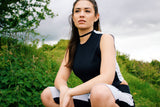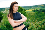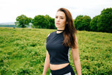Black and silver crop top made with vintage Adidas style tracksuit fabric. The crop top features black ribbed neck detailing and a silver metal tooth open zip at the back of the garment.