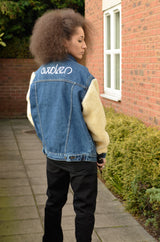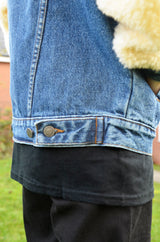 Blue denim jacket in excellent vintage condition sourced locally in Birmingham, UK. Re-worked faux sherpa sleeves hand sewn by the team at Awoken for the GOD / GODDESS touch.