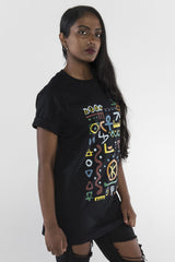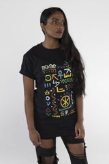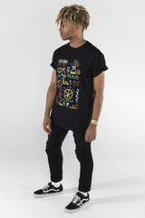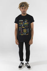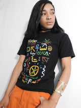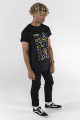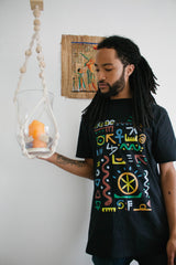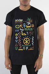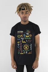 100% premium cotton soft feel black t-shirt. With inspiration from A Tribe Called Quest, we remixed the pattern to include symbols with some meaning. Included in the design are the 5 elements, DNA, Ankh, Knot of Isis, Hieroglyphics, Seed of Life, yin yang and the Fibonacci spiral.