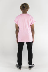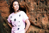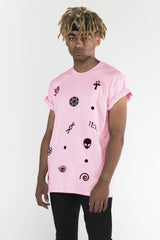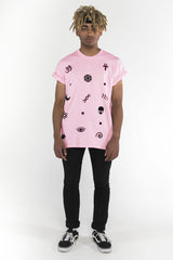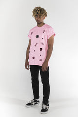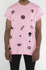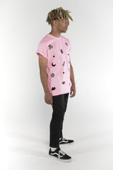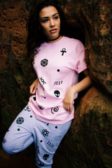 100% Cotton pink T shirt embellished with conscious universe symbols in a black flock applique.
