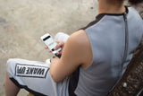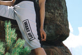 Black and silver Basketball shorts made with vintage Addidas style tracksuit fabric. An elasticated waistband and drawcord with a WAKE UP! stamp print on the left leg.